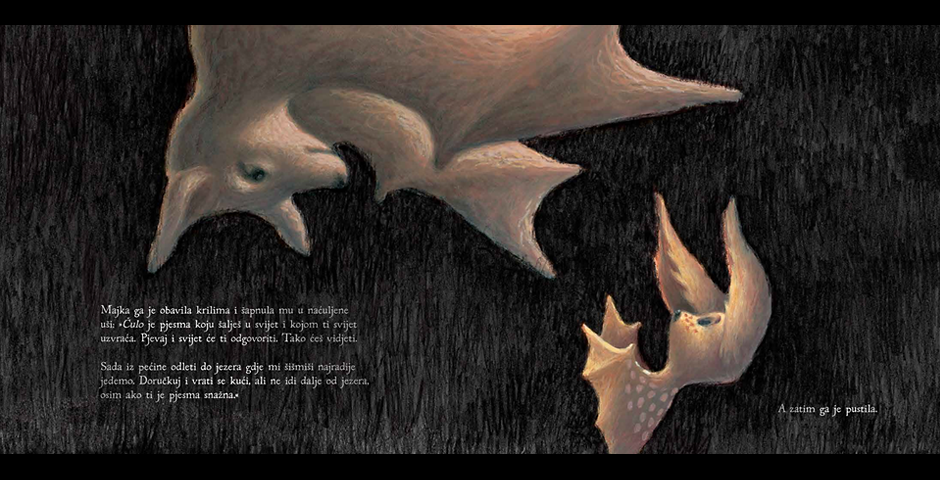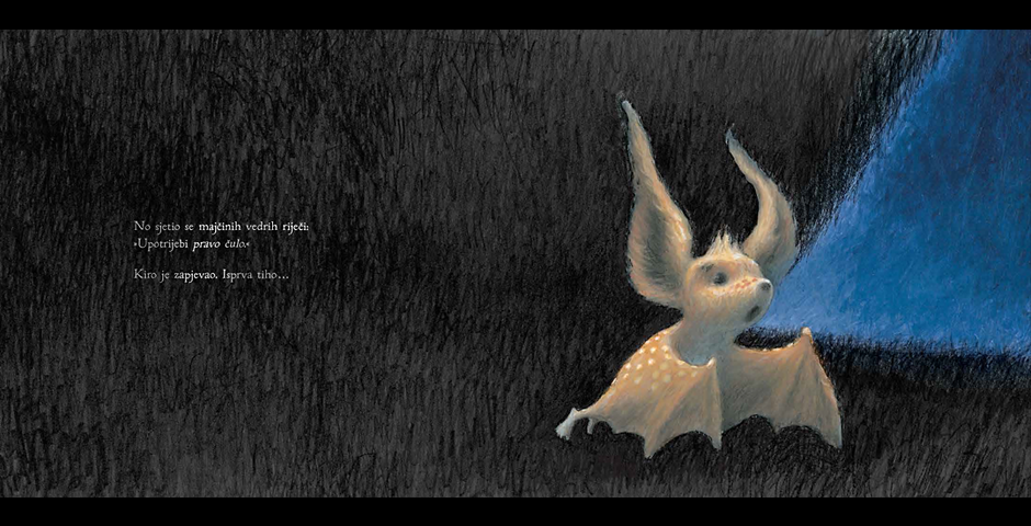 Glavni lik ne skriva se u tamnim koricama, već širi krila na naslovnici, pod zasjenjenim reflektorom mjesečine. Šišmišić živi u pećini, „zemljanom zaklonu“ sa svojom mamom – visi pod njezinim krilom, naopačke, kako to već šišmiši uvijek rade. Djeca imaju potrebu okretati slikovnicu da Kiru i mamu bolje vide, što je jako simpatično, a ima i edukativni potencijal. Uglavnom, mama na početku procjenjuje da je došao dan da Kiro prvi put sam ode od kuće. „Danas moraš odletjeti u svijet, a ja ću te ovdje čekati.“ Malac nije oduševljen. Žali se da je jako mračno i da u mraku ne vidi dobro, ali mama je sigurna da je vrijeme – ili se barem trudi djelovati sigurno. Nije mu baš rekla da se samo srcem dobro vidi, jer bitno je očima nevidljivo. Savjet je prilagođeniji netopirskoj svojti, ali poruka je jednako praktična i vrijedna: ako ti je jedno osjetilo oslabljeno, iskoristi ostala. Radi s onim što imaš. „Vidjeti se može i drugačije“, savjetuje mu mama, pošalji pjesmu u svijet i pjesma će ti se vratiti.
