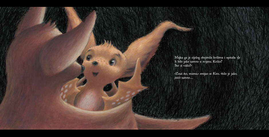 Crvenkapica nije poslušala mamu, znate već: skrenula je sa šumskog puta i razgovarala s neznancima, a jednako neposlušna bila je i Pepeljuga, pa je zakasnila doma i izgubila i cipelu i čaroliju. Ali Kiro je svoju mamu poslušao. Odletio je u mrak i poslao pjesmu u svijet – najprije bojažljivo, a onda sve sigurnije i glasnije. I svijet mu je uzvratio, ukazao mu se u mraku kao pod reflektorskim snopom. Samopouzdanje raste, strah nestaje, Kiro doručkuje i opušta se. Kad se nauživa i umori, shvati da je vrijeme za povratak u sigurnost spilje, gdje ga, sa strepnjom koju tek iskusni mogu nazrijeti u nijansi njezina glasa, čeka mama. I dok se svima ostalima budi dan, Kiro i mama se zagrle i kažu: laku noć.