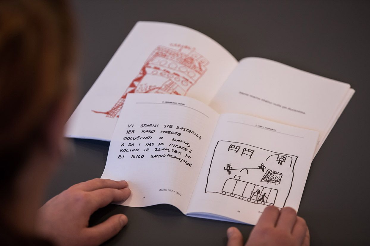 Napravila sam seriju od pet tematskih radionica s predškolcima i djecom koja idu u prvi razred osnovne škole, na kojima smo razgovarali o slikovnicama, filmovima i sličnom. Bilo je točno osmišljeno kako s njima možemo autentično razgovarati o različitim temama, bez da mi odrasli utječemo na njih. Odabrala sam djecu od 5 do 7 godina, tad su još uvijek relativno iskreni, još nisu posve ušli u sustav. Iz tih sam radionica izvukla neke današnje dječje izjave i iz toga je nastala mala umjetnička knjiga koja se sastoji od dva dijela. U jednom su dječje izjave iz socijalizma, a u drugom su izjave današnje djece s radionica.