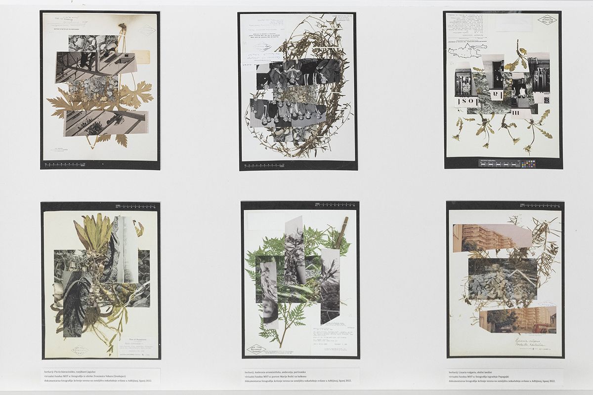 I tako sam dobila tri elementa koja koristim u kolažima: arhiv, herbarij i dokumentarne fotografije lokacije. Prilikom kolažiranja igrala sam se asocijacijama: ambrozija je isprepletena s portretom Marije Božić koja je tijekom Drugog svjetskog rata s mužem vodila kiosk na Trgu bana Jelačića koji je služio kao punkt pokreta otpora, a bršljan s fotografijama djece u Kučerinoj ulici koja se penju po metalnim stalcima za klofanje tepiha. Ovisno o kolažu, asocijacije su više ili manje apstraktne, ali dopuštaju narativnu igru o isprepletenosti i suživotu ljudske i biljne vrste. Jedini sloj koji je stalan na svim kolažima jest dokument parcele na kojoj je uništen biljni svijet kako bi se pripremila nova izgradnja. Sami prosudite koga ili što taj sloj zastupa (smijeh).