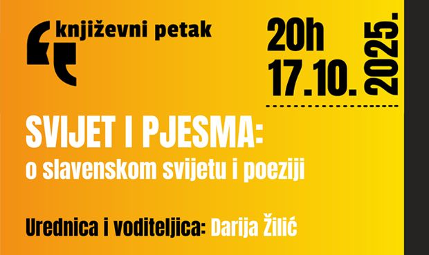Peta ovogodišnja tribina Književni petak, pod nazivom Svijet i pjesma: o slavenskom svijetu i poeziji, održava se u Mjesecu hrvatske knjige i otvara novu sezonu ciklusa Književnog petka.