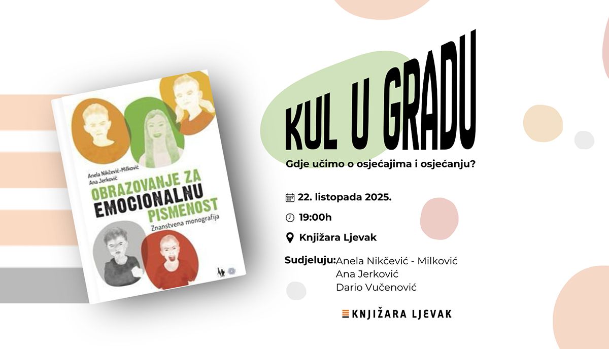 Na prvoj tribini jesenskog ciklusa Kul u gradu, koja će se održati u srijedu, 22. listopada, u 19 sati u Knjižari Ljevak u Zagrebu (Trg bana J. Jelačića 17), razgovarat će se o temi koja dotiče svakoga – osjećajima i emocionalnoj pismenosti.