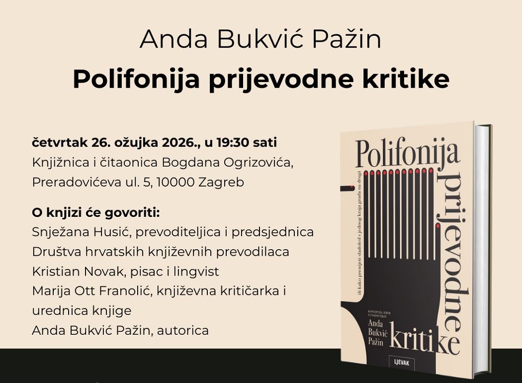 U četvrtak 26. ožujka 2026. u Knjižnici i čitaonici Bogdana Ogrizovića s početkom u 19:30 sati, Naklada Ljevak predstavit će znanstveno-umjetničku knjigu "Polifonija prijevodne kritike ili kako prenijeti sladoled s jednog kraja grada na drugi", koja istražuje nove prostore pisanja i razmišljanja.