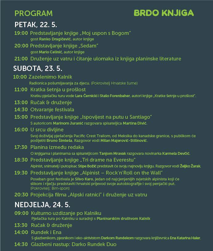 Festival u petak navečer otvaraju autori Ranko Dragičević i Mario Celinić, uz predstavljanje novih naslova, dok središnji, cjelodnevni subotnji program donosi jutarnju akciju pošumljavanja okolice Planinarskog doma Kalnik – Planinarac, vođenu turu Kalnikom za festivalsku publiku te svečano otvorenje, književne promocije i razgovore do večeri te festivalski krijes.